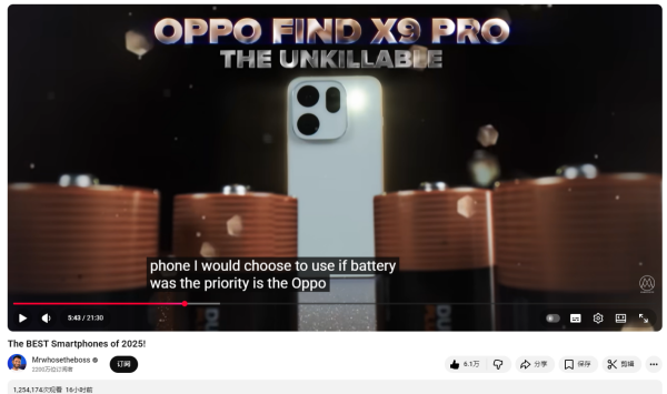 OPPO Find X9 Pro能横扫泰西顶流KOL奖项,中枢在于其“全场景无短板”的旗舰弘扬。行动领有数千万订阅用户的行业泰斗,MKBHD与Mrwhosetheboss的评测向来以严苛著称,二者同期景仰一款机型的情况终点有数,前者聚焦影像硬实力将其评为“最好拍照手机”,后者则从轮廓体验起程授予其“年度最好手机”,并卓著认同其续航弘扬颁发“最好续航大奖”。